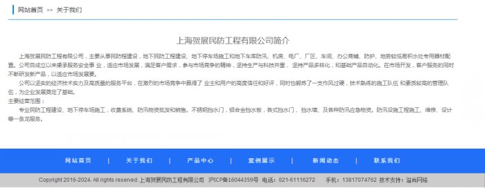 上海賀展民防工程有限公司,主要從事民防程建設(shè),地下民防工程建設(shè)、地下停車場(chǎng)施工和地下車庫(kù)防汛、機(jī)房、電廠、廠區(qū)、車間、辦公商鋪、防護(hù)、地勢(shì)較低易積水處專用器材配置。公司自成立以來(lái)秉承服務(wù)安全事 業(yè),適應(yīng)市場(chǎng)發(fā)展,滿足客戶需求,參與市場(chǎng)競(jìng)爭(zhēng)的精神,堅(jiān)持生產(chǎn)與科技并重, 堅(jiān)持產(chǎn)品多樣化,和基礎(chǔ)產(chǎn)品自動(dòng)化。在市場(chǎng)開發(fā),客戶服務(wù)的同時(shí)不斷研發(fā)新產(chǎn)品,以適應(yīng)市場(chǎng)發(fā)展需要。