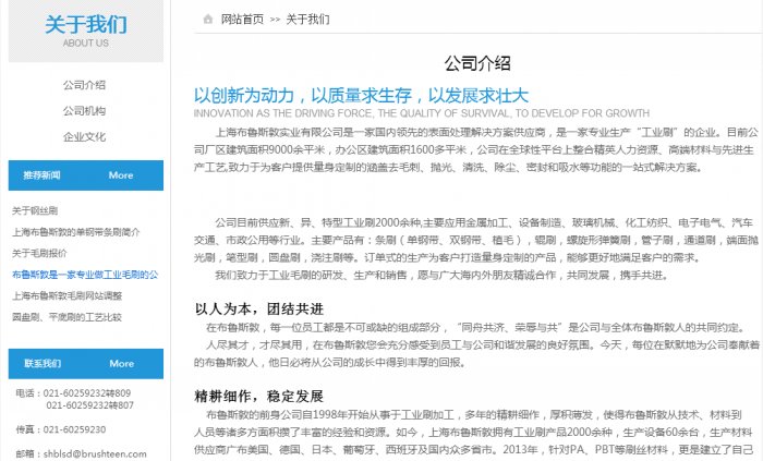 上海布魯斯敦實業有限公司是一家國內領先的表面處理解決方案供應商,是一家專業生產“工業刷”的企業。目前公司廠區建筑面積9000余平米,辦公區建筑面積1600多平米,公司在全球性平臺上整合精英人力資源、高端材料與先進生產工藝,致力于為客戶提供量身定制的涵蓋去毛刺、拋光、清洗、除塵、密封和吸水等功能的一站式解決方案。公司目前供應新、異、特型工業刷2000余種,主要應用金屬加工、設備制造、玻璃機械、化工紡織、電子電氣、汽車交通、市政公用等行業。主要產品有:條刷(單鋼帶、雙鋼帶、植毛),輥刷,螺旋形彈簧刷,管子刷,通道刷,端面拋光刷,筆型刷,圓盤刷,澆注刷等。訂單式的生產為客戶打造量身定制的產品,能夠更好地滿足客戶的需求。