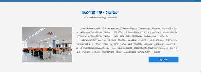 上海豪朵生物科技有限公司是一家專業從事化工原料等產品生產加工銷售的企業,擁有完整、科學的質量管理體系。主要業務有工業過氧化氫(雙氧水)(7%-70%),食品級過氧化氫(雙氧水)(3%-50%),試劑級過氧化氫(雙氧水),電子級過氧化氫(雙氧水),硝酸,甲醇,甲胺,甲胺醇系列,酸堿清洗劑等二十多種產品。