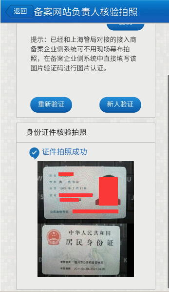 重新驗(yàn)證:如果您的核驗(yàn)拍照環(huán)境光線不清楚時(shí),可以選擇重新驗(yàn)證。點(diǎn)擊會(huì)重新進(jìn)入備案網(wǎng)站手機(jī)當(dāng)面核驗(yàn)拍照,驗(yàn)證成功將替換上次手機(jī)核驗(yàn)拍照?qǐng)D片。