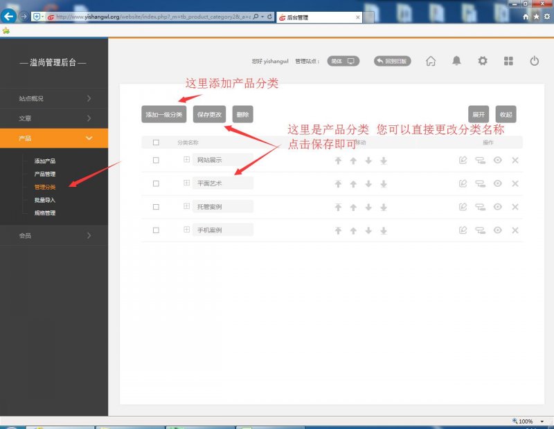 7. 修改分類添加分類:點擊管理分類,可以添加產品分類,也可以修改產品分類