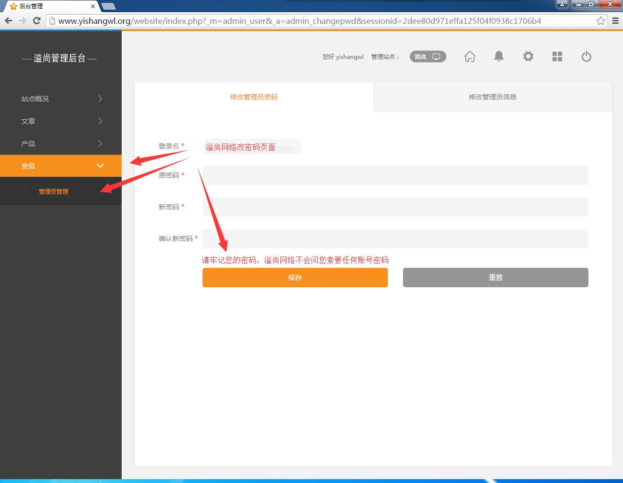 3.當您第一次拿到后臺賬號密碼的時候,記得更改密碼以便保證您的網站后臺資料的安全以及保密度。溢尚網絡全體員工不會詢問您索要賬號以及密碼。